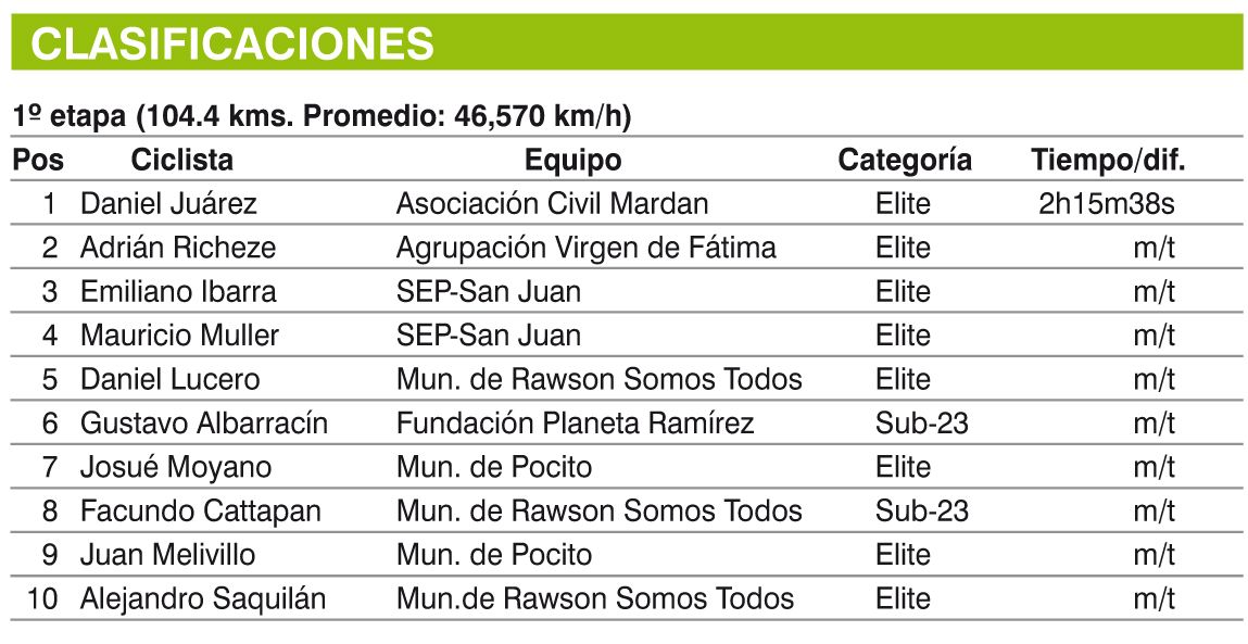 Siempre da que hablar. Por su entrega, sacrificio y hambre de gloria, Daniel Juárez se merecía su victoria. El ciclista de la Mardan protagonizó una fuga junto a una decena de ciclistas y se quedó con la primer etapa de la Vuelta del Este que finalizará hoy, segundo finalizó Adrián Richeze (AVF) y tercero Emiliano Ibarra (SEP-San Juan). El “Chaqueño” lidera la competencia que organizada por el Caucete Pedal Club, pondrá en disputa hoy por la mañana una CRI y por la tarde definirá el dueño de esta novata competencia.