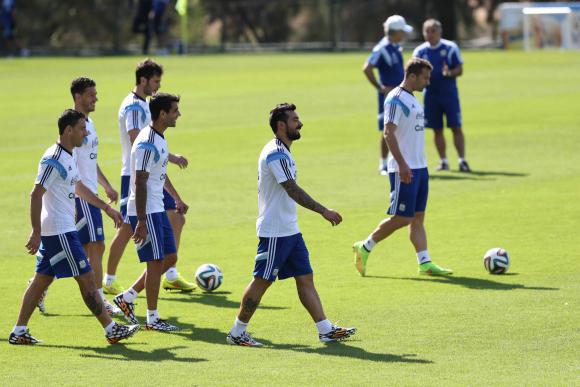 Sabella indicó un entrenamiento liviano, que los jugadores iniciaron con un trote y continuaron con una práctica de fútbol-tenis. Otros jugadores ejercitaron tiros al arco, en medio de un clima distendido en la capital del estado de Minas Gerais.