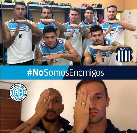 Parte del plantel de Belgrano posó en el vestuario haciendo con sus manos la "T" que simboliza a Talleres. Entre ellos están Guillermo Farré, un símbolo de Belgrano, junto a Matías Suárez, Lucas Melano, Lucas Acosta, Federico Álvarez, Esteban Espíndola López y Gastón Álvarez Suárez.