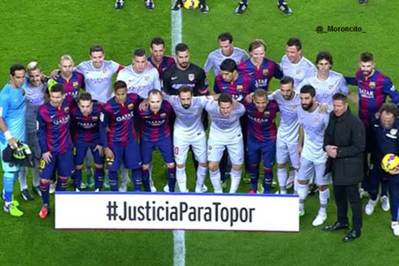 El Barcelona y el Atlético de Madrid reclamaron ayer justicia para el periodista deportivo argentino Jorge "Topo" López, fallecido en un accidente de tráfico mientras cubría el Mundial de Brasil 2014. Antes de enfrentarse en la décimo octava fecha de la Liga española de fútbol, los jugadores de ambos equipos, que mantenían vínculos con el cronista de Olé, se fotografiaron sobre el césped del Camp Nou frente a una pancarta que rezaba "Justicia para Topo" (foto).