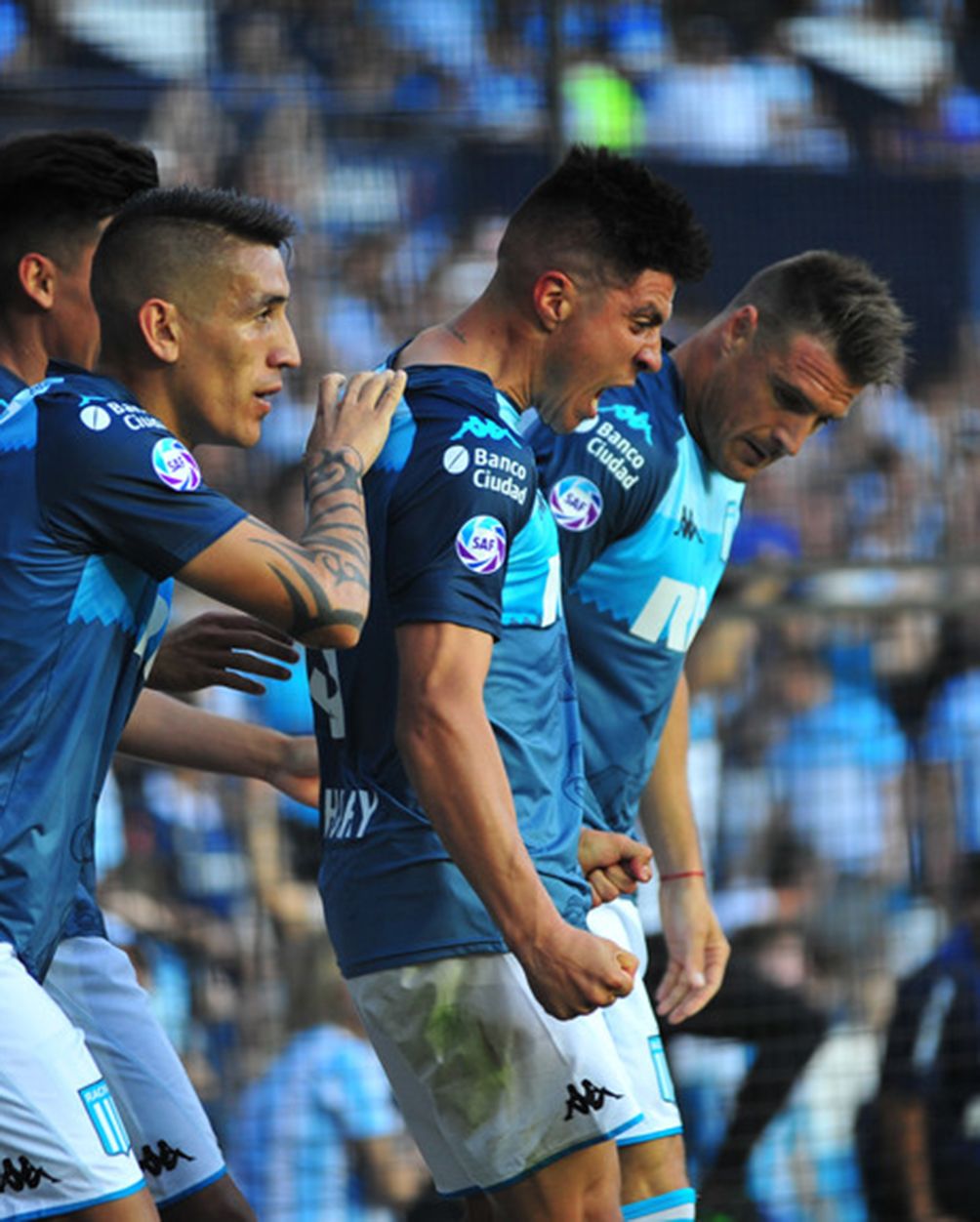 Se aleja. Cristaldo y todo Avellaneda festejan el gol que a la larga sería el de la victoria para el líder. Racing volvió a ganar y continúa estirando la brecha en la punta.