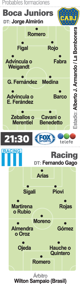 El técnico Jorge Almirón tiene la duda en el sector derecho de la defensa, el cual pelean Marcelo Weigandt y Luis Advíncula. El DT boquense, que no paró un equipo en toda la semana, tendrá que reacomodar el mediocampo tras la salida del volante central Alan Varela al Porto de Portugal. Entonces jugarían Guillermo "Pol" Fernández, Cristian Medina y Valentín Barco, aunque Ezequiel "Equi" Fernández podría sumarse a esa zona de la cancha si Advíncula juega de 4.