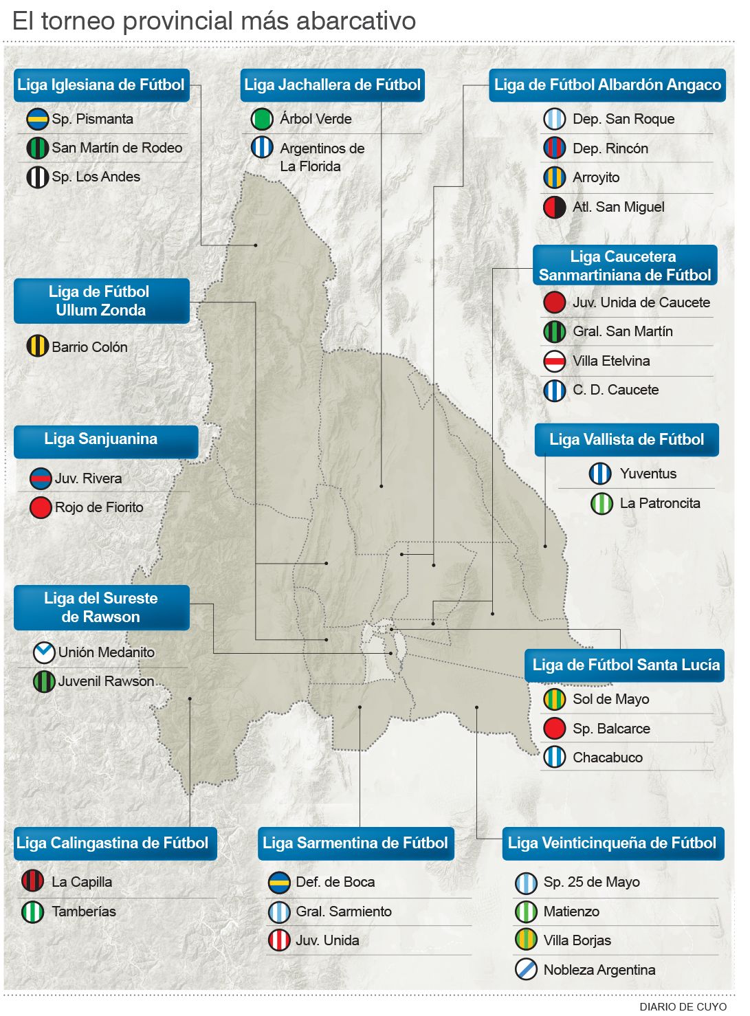 En apenas tres semanas, otra historia. Otra edición de la Copa de Clubes Campeones-DIARIO DE CUYO ya empezó a jugarse porque en la sede de la Federación Sanjuanina, se terminaron de confirmar los 32 protagonistas de la versión 2024 buscando coronar al mejor del mapa profundo de la provincia y el plus de la clasificación al Regional Amateur 24-25. Con la clasificación de Sportivo Pismanta de Las Flores como campeón del Torneo Clausura de la Liga Iglesiana tras vencer a San Lorenzo, se completó el cuadro de las ocho zonas para la Fase Clasificatoria que se sortearán en esta semana. Así, por la Liga Iglesiana además de Pismanta, estarán Los Andes de Tudcum y San Martín de Rodeo.