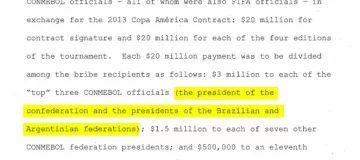 El escrito sostiene que el total de coimas fue de 100 millones de dólares: 20 millones sólo por firmar el acuerdo y 20 millones por cada una de las cuatro ediciones de la Copa América. Por cada 20 millones, los presidentes de Conmebol, AFA y CBF se llevaban 3 millones, mientras que los otros siete presidentes de la entidades que integran la federación que nuclea al fútbol sudamericano cobraron 1,5 millones. El restante medio millón iba al bolsillo de un "oficial de Conmebol" del que no se dan más precisiones.