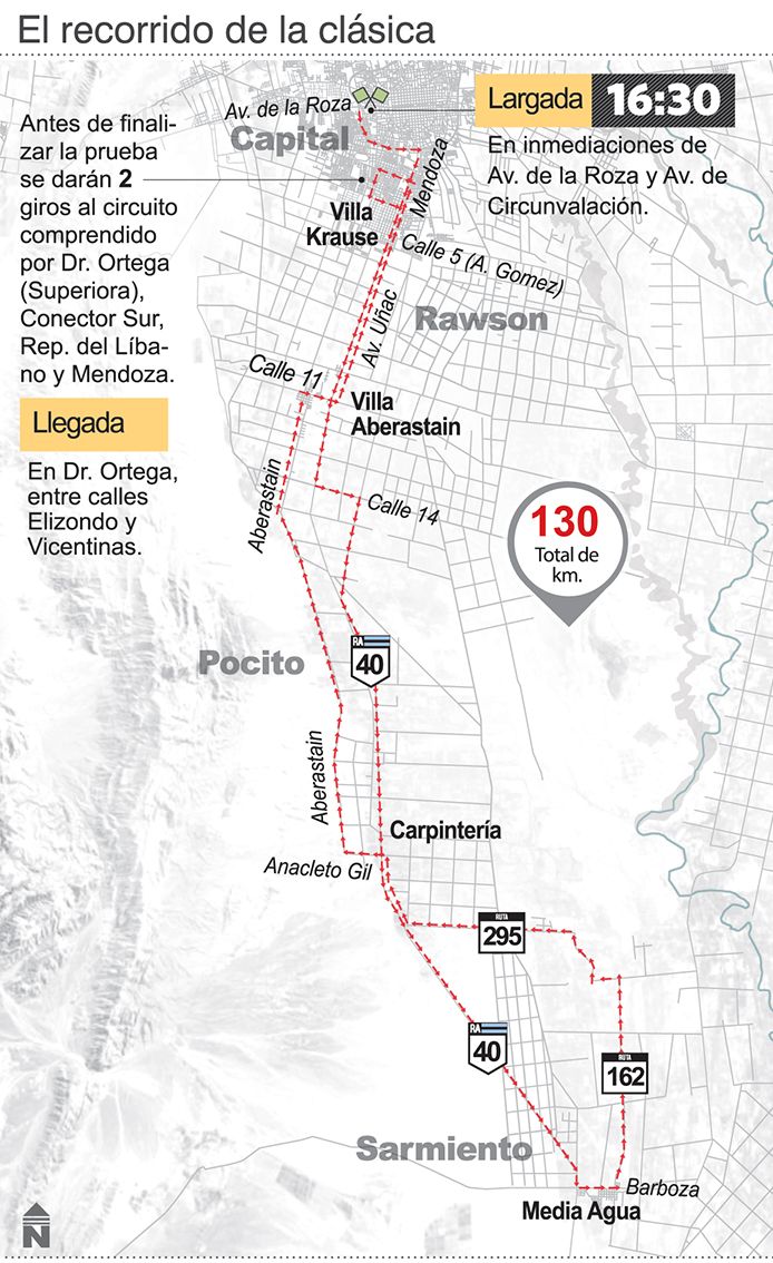 Luego de partir de Capital (ver infografía), ir y retornar de la villa cabecera del Departamento Sarmiento, la carrera culminará en Rawson, después de cruzar -a lo largo- Pocito.