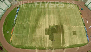 El campo de juego del Mario Alberto Kempes parece haber sido bombardeado, pero no. A fin de mes, sobre ese césped jugarán Argentina y Bolivia. El color amarillo, los huecos en la cancha y mucha tierra dieron cuenta de las malas condiciones del ‘verde’ del recinto mundialista ubicado en Córdoba.