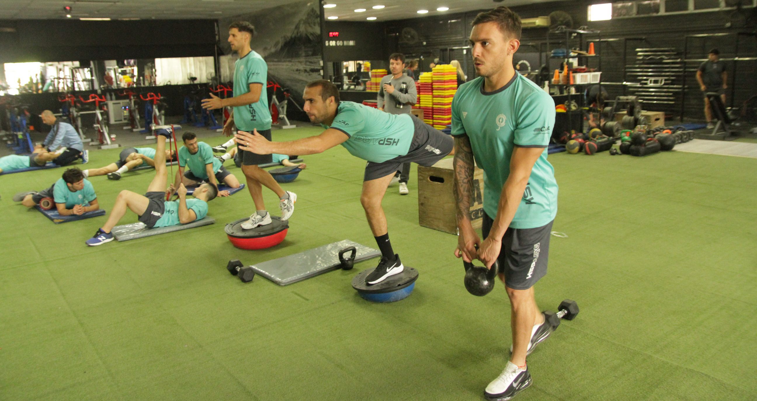 Por la mañana -al compás de la música que mezcló cuartetos con cumbia- el grupo trabajó por una hora en el coqueto Gimnasio A2 Club (ubicado sobre Av. Central), propiedad de Pablo Aguilar. Ya por la tarde-noche la práctica fue en el estadio de UPCN, donde hicieron movimientos de ataque-defensa y después jugaron mini-partidos.