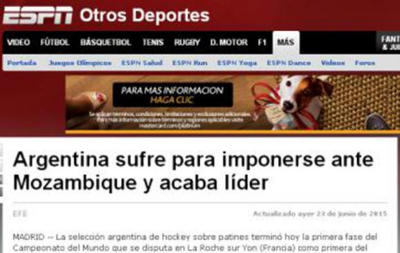Si alguien tiene una duda respecto que el hockey sobre patines sólo se vive en nuestro país de manera especial en San Juan, y en mucha menor medida en la vecina Mendoza, basta con observar los diferentes medios nacionales de comunicación y la escasa cobertura periodística que le están brindando al Mundial. Ni siquiera los buenos resultados del equipo dirigido por Darío Giuliani, que sólo tiene hockistas de nuestra provincia y Mendoza, generan un mayor eco en las primeras planas o en la televisión. A lo largo de la disputa del Grupo B en el certamen ecuménico, que se adjudicó la Argentina, apenas noticias escuetas en el diario deportivo Olé, ESPN o La Nación (todos en sus ediciones digitales en internet) reflejaron los resultados albicelestes.