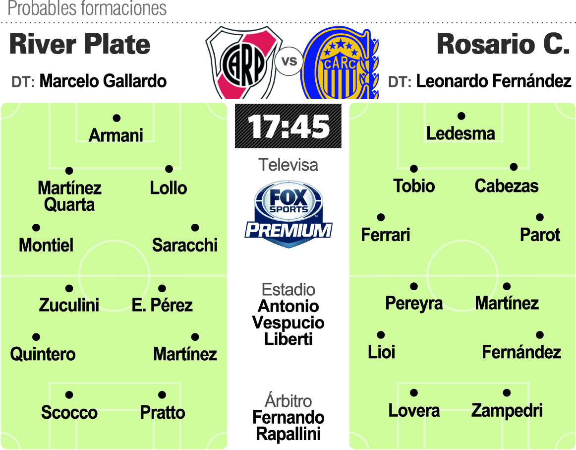 River Plate recibirá a Rosario Central en busca de su quinta victoria seguida en la Superliga Argentina de Fútbol (SAF) por la 25ta fecha. Jugarán desde las 17.45 en el estadio Monumental de Núñez, con el arbitraje de Fernando Rapallini, en un encuentro que transmitirá Fox Sports Premium. El equipo dirigido por Marcelo Gallardo quiere seguir sumando en la Superliga para clasificarse a las copas, aunque guardará a varios de sus jugadores históricos para el encuentro por Copa Libertadores que tiene el jueves próximo ante Emelec en Ecuador.
