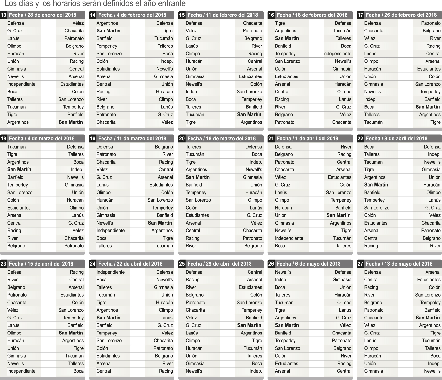 De hecho esto forzó el diseño de un organigrama para todo este último semestre del año, que abarca las 12 primeras fechas del campeonato, con días y horarios. Algo que con el torneo dependiendo de AFA no se hacía. Incluso aseguran que el fixture será respetado a rajatabla, lo que reflejaría otro notorio cambio para el fútbol mayor.