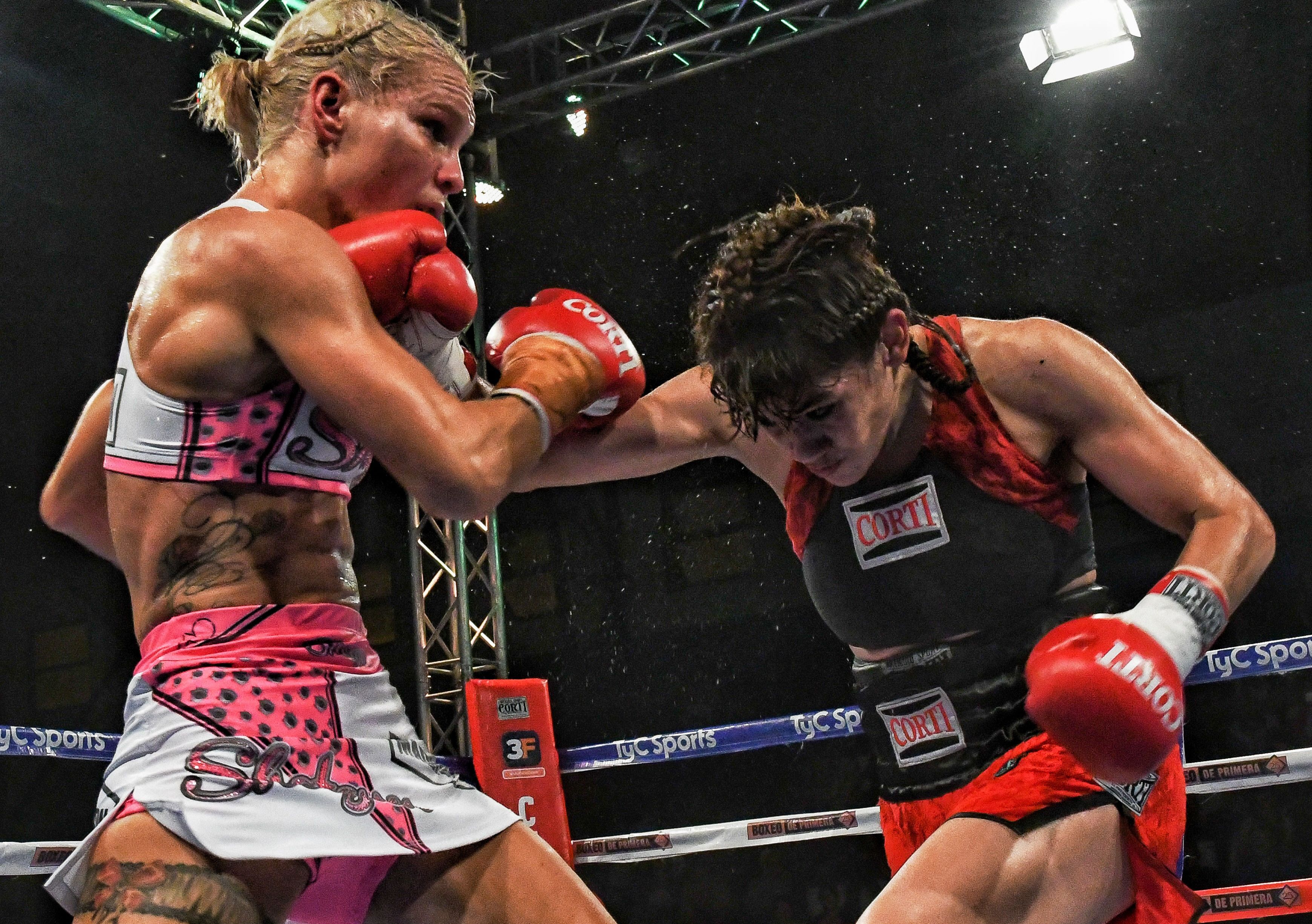 Golpe por golpe. La Tigresa Acuña le gana a la australiana O’Connell en el intercambio de golpes internos. La argentina retuvo el título supergallo.