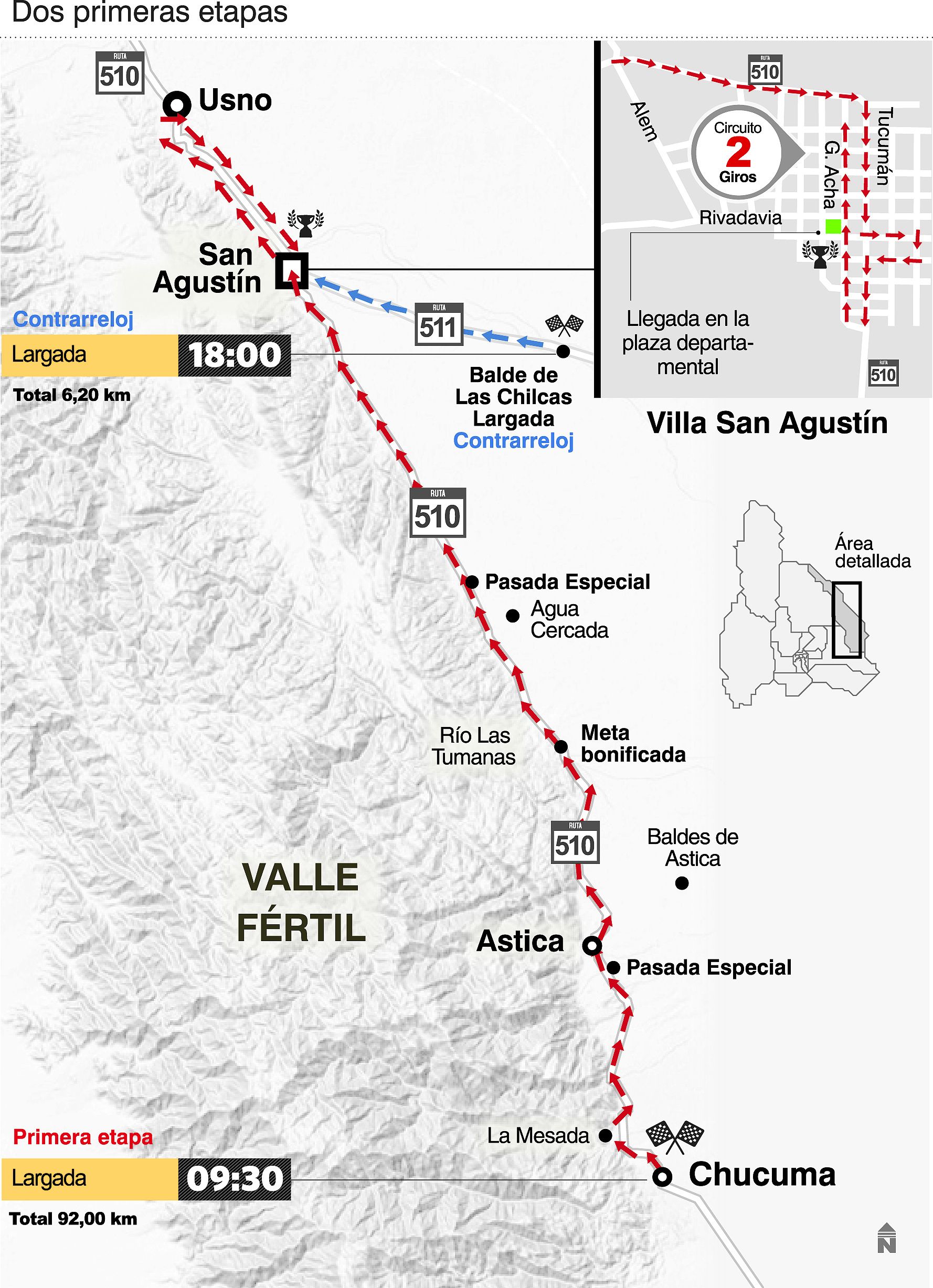 La competencia se abrirá con un tramo en pelotón que se iniciará en Chucuma y que luego de pasar por San Agustín llegará hasta Usno, donde se girará en ‘U’ y se pondrá proa hacia la villa cabecera. La línea de meta será frente a la plaza departamental, donde concluyó el parcial de la Vuelta a San Juan. Dicho final tiene una curva en 90 grados a 500 metros de la línea de llegada por lo que de haber embalaje masivo, quien entre a la curva de cabeza tendrá mayores opciones de quedarse con la victoria tras totalizar 92 kilómetros.