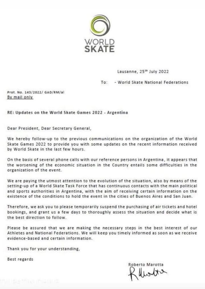 Estamos prestando la máxima atención a la evolución de la situación; también mediante la constitución de un World Skate Task Force que mantiene contactos continuos con las principales autoridades políticas y deportivas de Argentina, con el objeto de recibir cierta información sobre la existencia de las condiciones para la realización del evento en las ciudades de Buenos Aires. Aires y San Juan