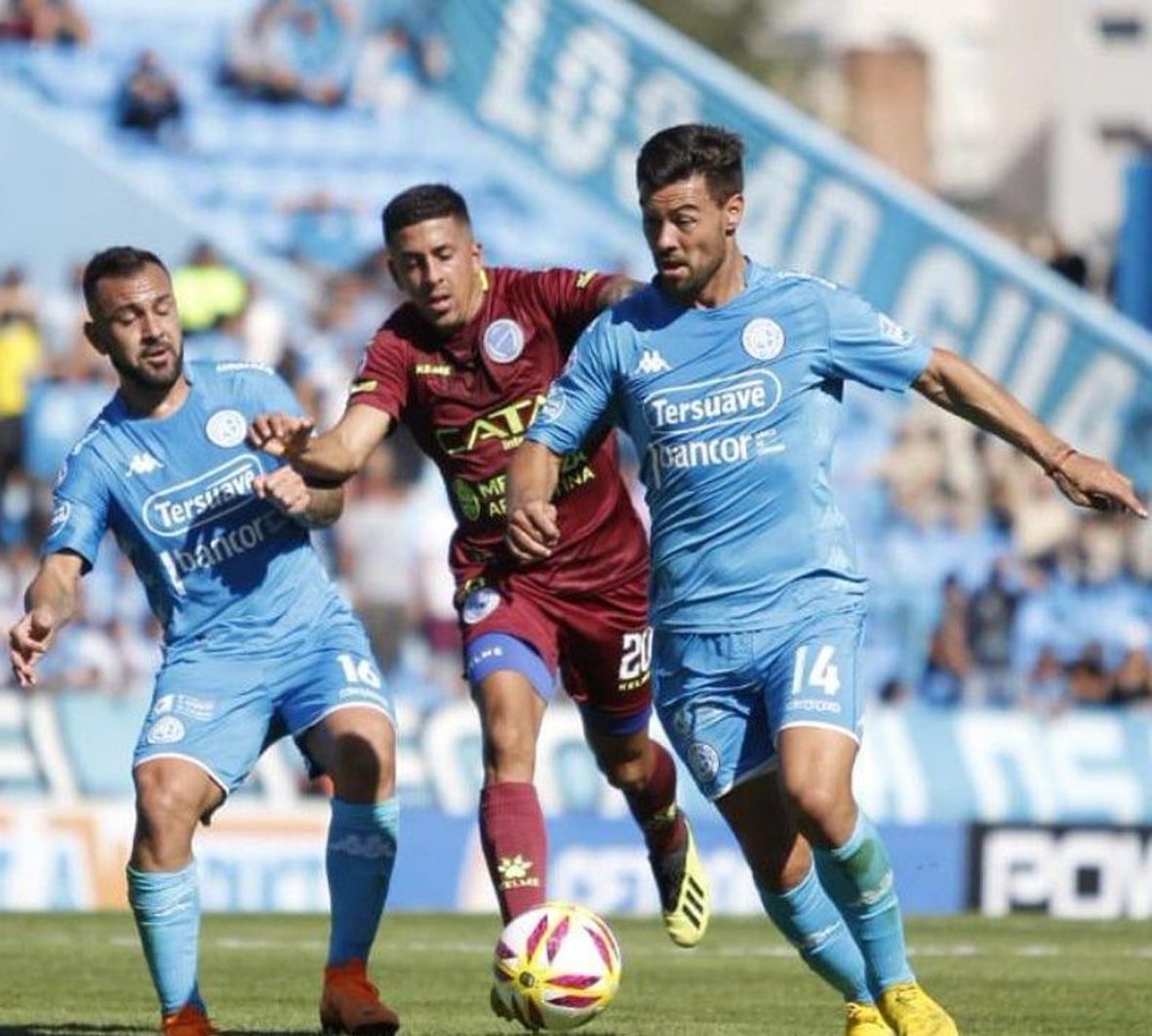 Marca. Federico Lértora y Maxi Lugo anulan la intervención del volante de Godoy Cruz. En Córdoba, Belgrano venció al Tomba pero la victoria de Patronato lo condenó a la B Nacional.