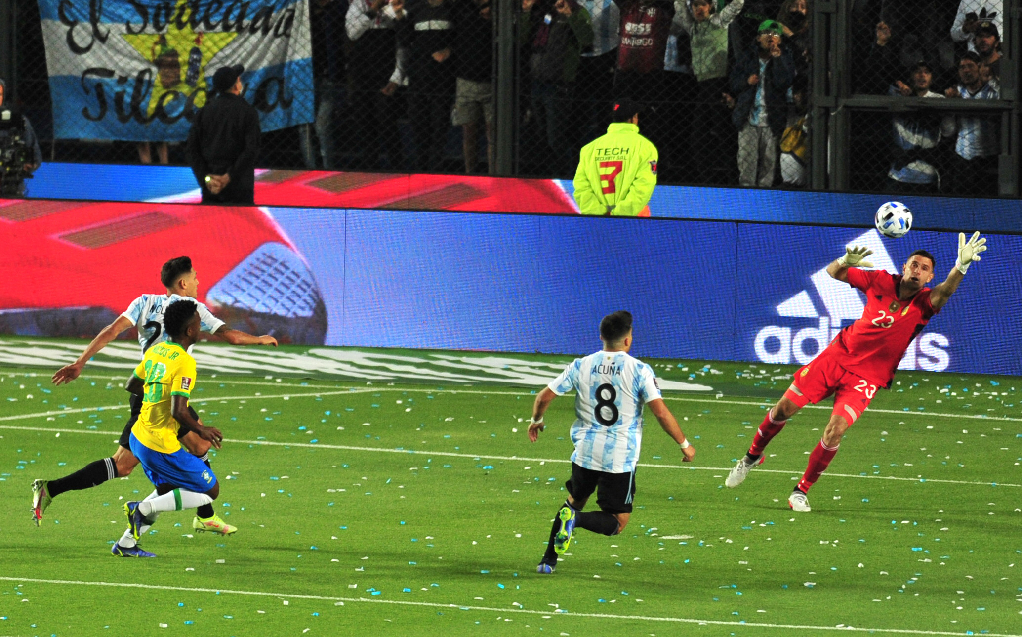 De ajedrez, así. En ese nivel, donde el más mínimo detalle pesa y define, Argentina no pudo sacarse ventajas con un Brasil compacto que siguió sosteniendo su invicto en Eliminatorias. Pero después esa fiesta inicial del Bicentenario terminó de completarse cuando los resultados de Uruguay, Colombia y Chile le dieron el pasaje al Mundial 2022. Pero claro, en este capítulo 14 del camino al próximo Mundial, en San Juan todos querían festejar victoria en el clásico. No se dio. No pudo Argentina ante un rival de elite dentro de un partido muy parejo, con pocas opciones de gol y con tanto en juego. En la primera parte, los de Scaloni intentaron imponer condiciones desde el comienzo pero su presión inicial se diluyó cuando Brasil se movió en bloque y le quitó espacios. La falta de ritmo de Paredes, la irregularidad de Lo Celso conspiraron contra la idea de Argentina de ir a buscarlo por todos lados. Brasil respondió con la calidad de Lucas Paquetá y la velocidad de Vinicius Jr en la contra para terminar armando un primer tiempo sumamente equilibrado. Incluso hasta en las opciones que fueron pocas. Lautaro Martínez tuvo alguna que Marquinhos tapó con lo justo. Luego, en la más clara de todas para Argentina, sobre los 40" de esa primera parte, De Paul midió el remate desde la medialuna del área al palo izquierdo de Alisson que tapó esa pelota infernal cuando parecía gol.