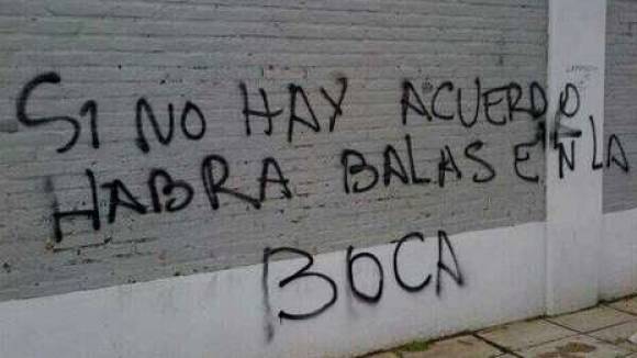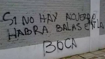 El fútbol argentino sumó ayer otro testimonio de la violencia que lo envuelve, al aparecer en el predio de Casa Amarilla una pintada amenazante donde se promete ‘bala‘, supuestamente en torno a que haya visitantes en el Superclásico. ‘Si no hay acuerdo habrá bala en La Boca‘, escribió un anónimo en la noche y por la mañana empleados de mantenimiento del club taparon con otra capa de pintura. n Boca sostienen que se debe a las exigencia de la barra de que haya acceso a visitantes al superclásico con River que se jugará por la décima fecha del torneo Inicial el domingo 6 de octubre.