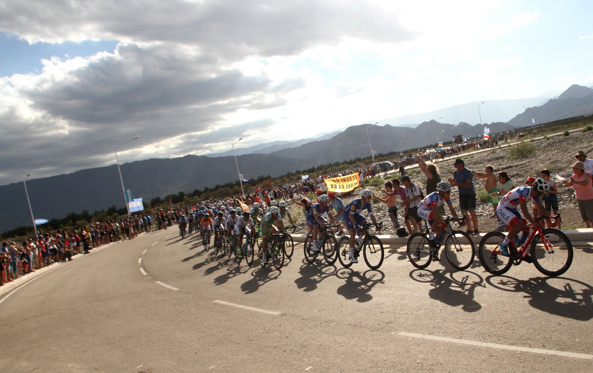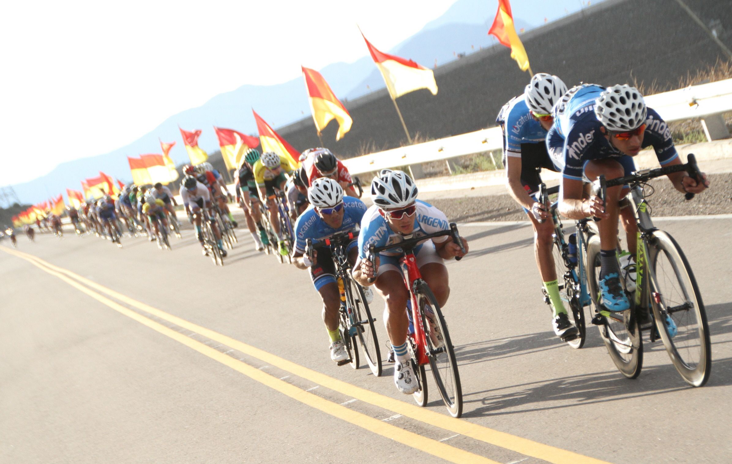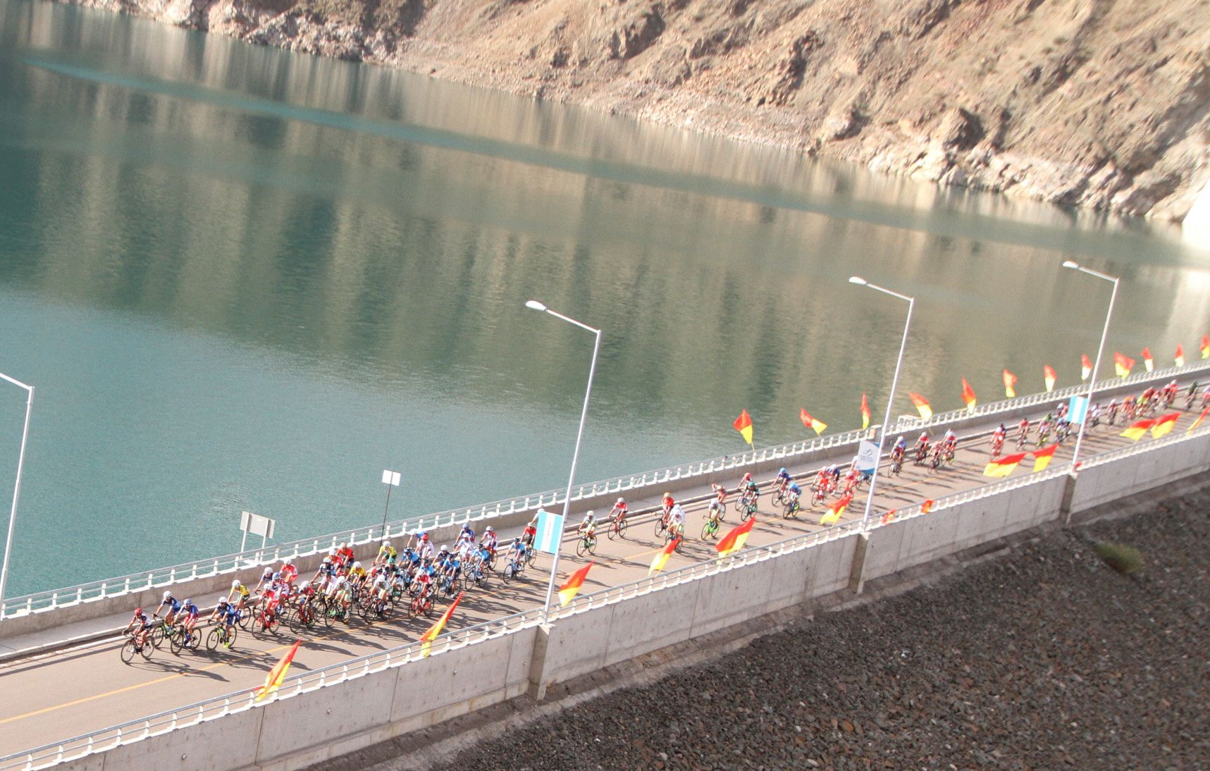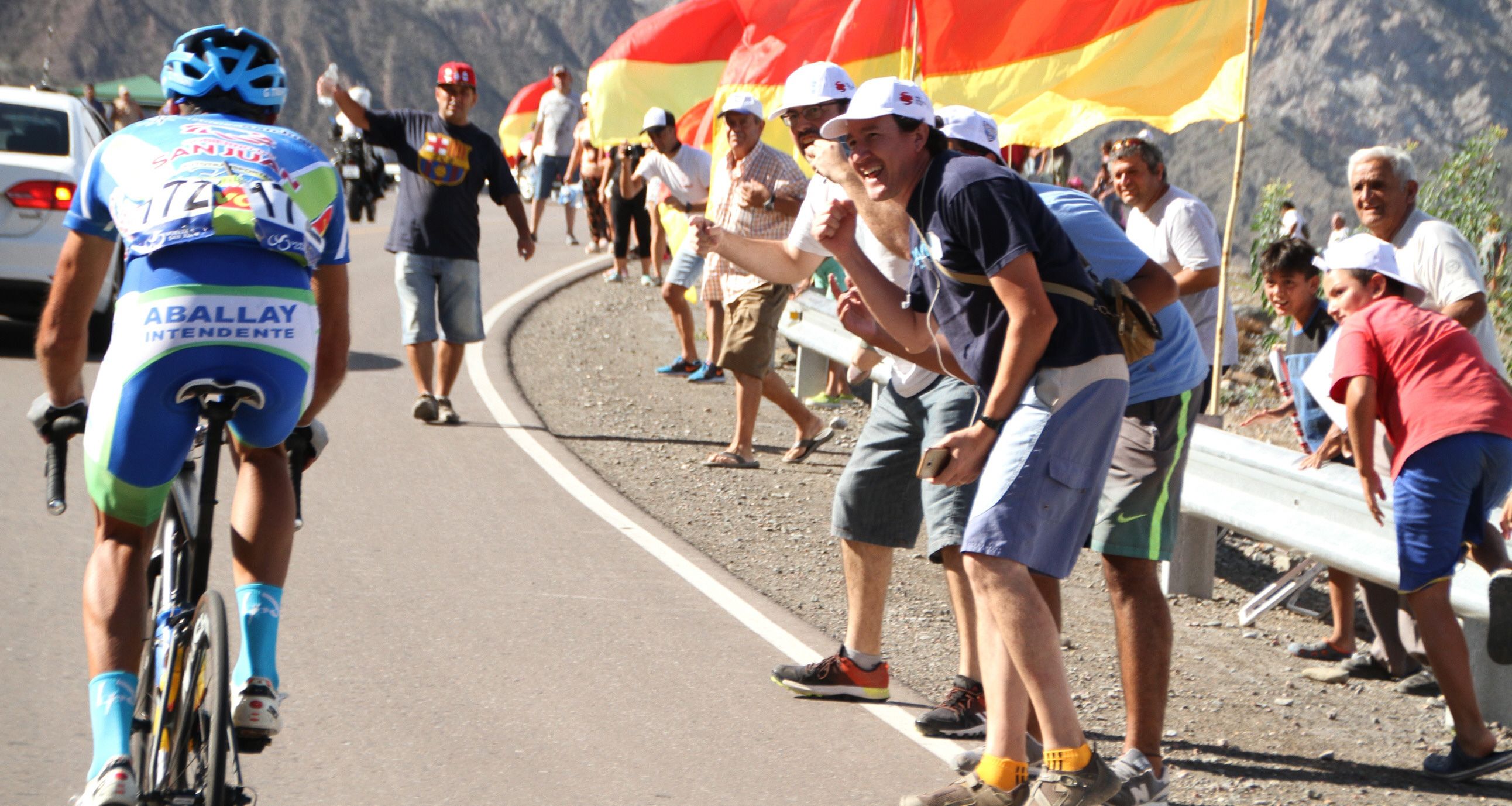 Por allí pasaron solo una sola vez, pero ese ascenso al Dique de Ullum fue visto por muchos seguidores que se dieron cita para ver una postal clásica en cada Vuelta. El colorido del pelotón que en ese momento estaba a 5″ de los fugados, se fundía con los colores del paisaje imponente de los cerros ulluneros y también de los colores rojo y amarillo de las clásicas banderas de la Agrupación.