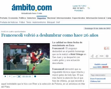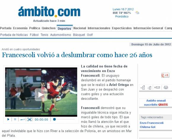 San Juan, 16 de julio.- El Estadio Bicentenario fue testigo de uno de esos goles que será recordado eternamente. A los 50 años, Enzo Francescoli demostró en San Juan que su magia sigue intacta, convirtiendo un golazo de chilena, del que se hicieron eco todos los medios de comunicación nacionales.