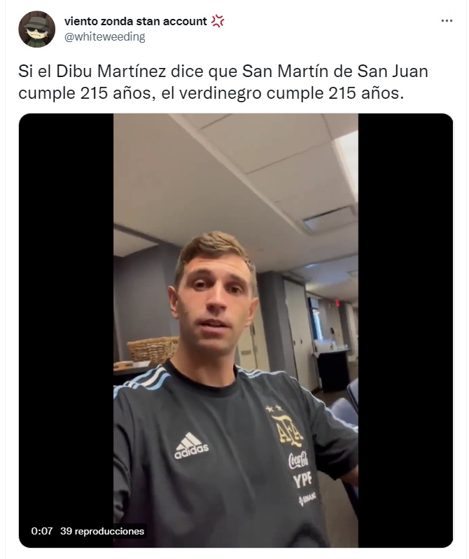 "Felicidades por estos 115 años para mi querido equipo San Martín de San Juan", se le escucha decir al "Dibu" pero según el criterio de cada oyente pareciera decir "215 años" y eso generó debate en las redes.