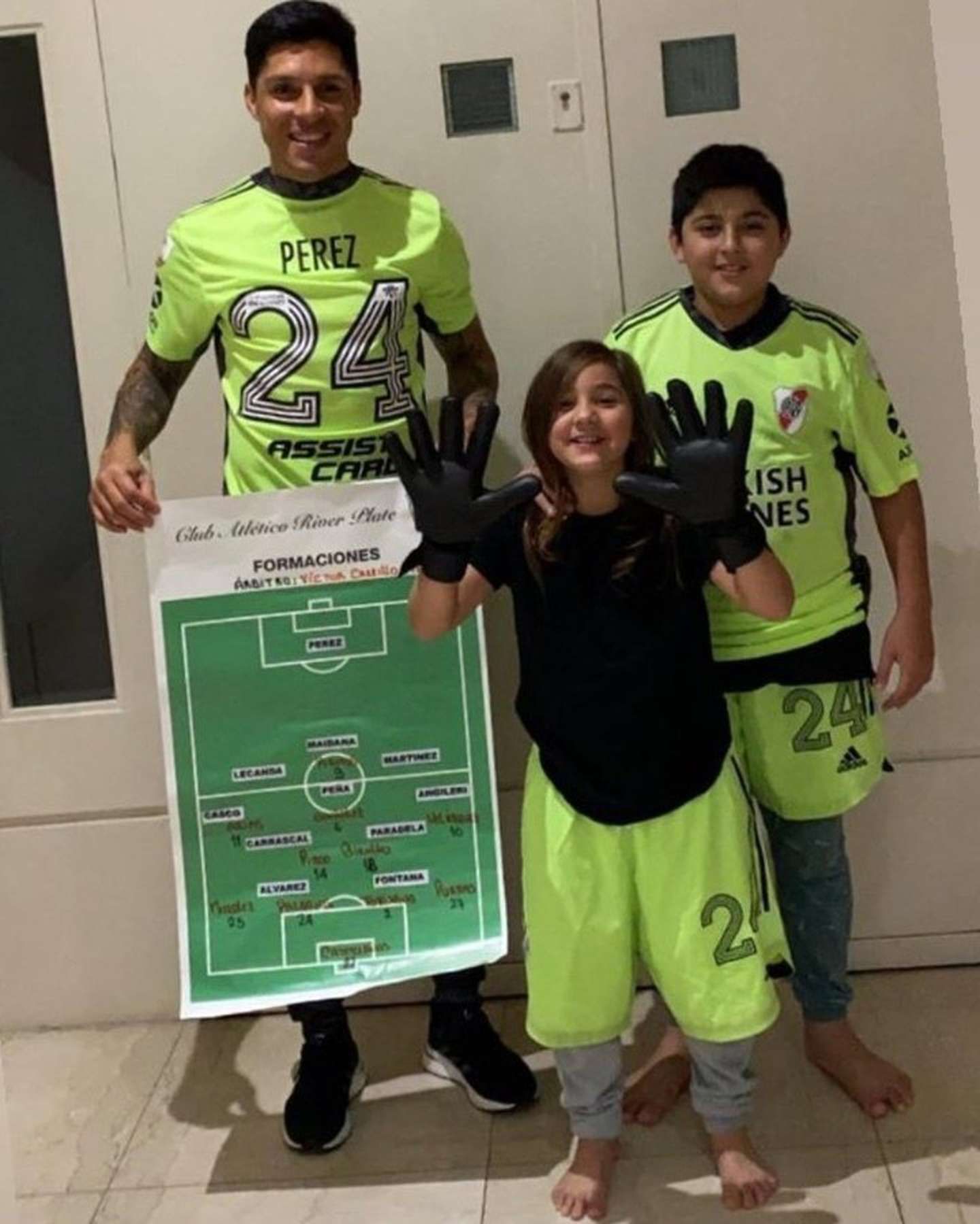 Al final del partido el jugador se fotografió junto a sus hijos, Santiago y Pía, todos vestidos con el que ya es un histórico buzo.