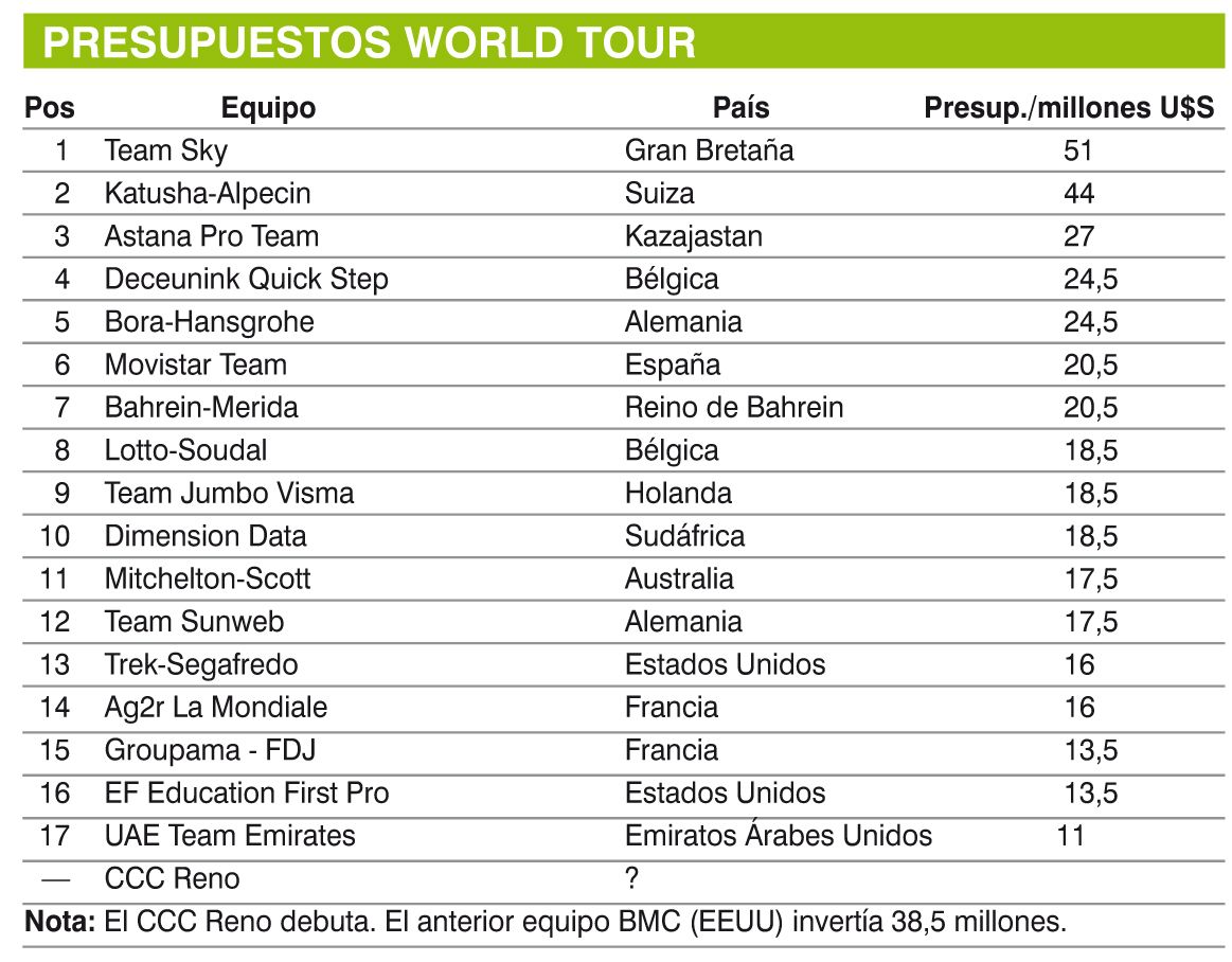 Hace un par de años el diario francés L"Equipe, previo al Tour de Francia, reveló los presupuestos anuales de los equipos UCI World Tour, la Fórmula 1 del ciclismo mundial. Apelando a los conocimientos del director de un equipo de la categoría inferior, la PCT (Pro Continentales Team) que sugirió se le agregara a esos montos un 20 por ciento, "diez por año es lo que suele sumarse", explicó es que salta a la luz la tabla que ilustra este informe que muestra la abismal diferencia entre los montos que maneja el equipo británico Sky y lo que invierte el UAE Emyrates.
