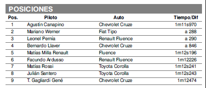 A su vez, esos seis clasificados fueron Canapino, Pernía, Werner, Llaver, Milla y Ardusso. Estos dos últimos, pilotos de Renault, decidieron no salir a clasificar directamente. Con esta decisión del equipo no sólo evitaron la chance eventualmente de mejorar sus posiciones y cargar kilos sino que ahora, livianos, largarán delante de Rossi buscando favorecer a Pernía.