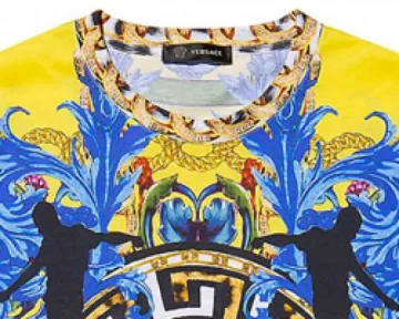 Esta remera estilo "Santana" está decorada con imágenes repetidas de fútbol y flores. Cadenas de oro y animal print le agregan "lujo", dice Versace en su sitio.