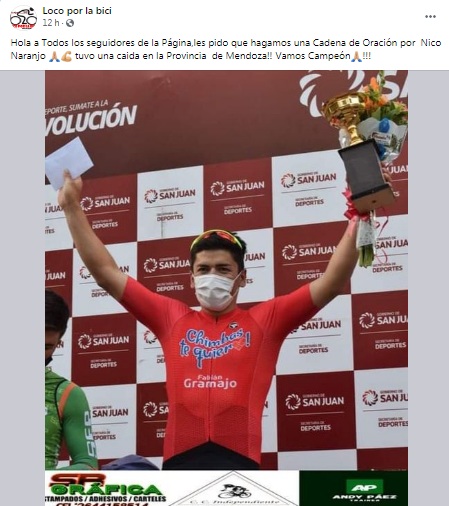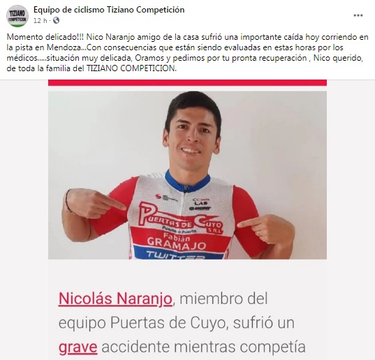 La noticia causó gran impacto entre los sanjuaninos. Nicolás Naranjo sufrió un grave accidente mientras se disputaba una fecha más de la temporada mendocina de ciclismo de pista. El joven oriundo de La Bebida e integrante del equipo "Chimbas te quiero", tuvo un fuerte golpe en la cabeza y se encuentra luchando por su vida.