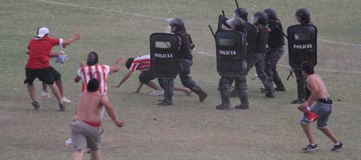 Los efectivos a cargo del operativo de seguridad reprimieron a los hinchas que atacaron con piedras a los uniformados. Uno de ellos, Martín Villalobo, recibió un fuerte golpe y debió ser trasladado al Servicio de Urgencia del hospital Rawson con un importante traumatismo ocular.