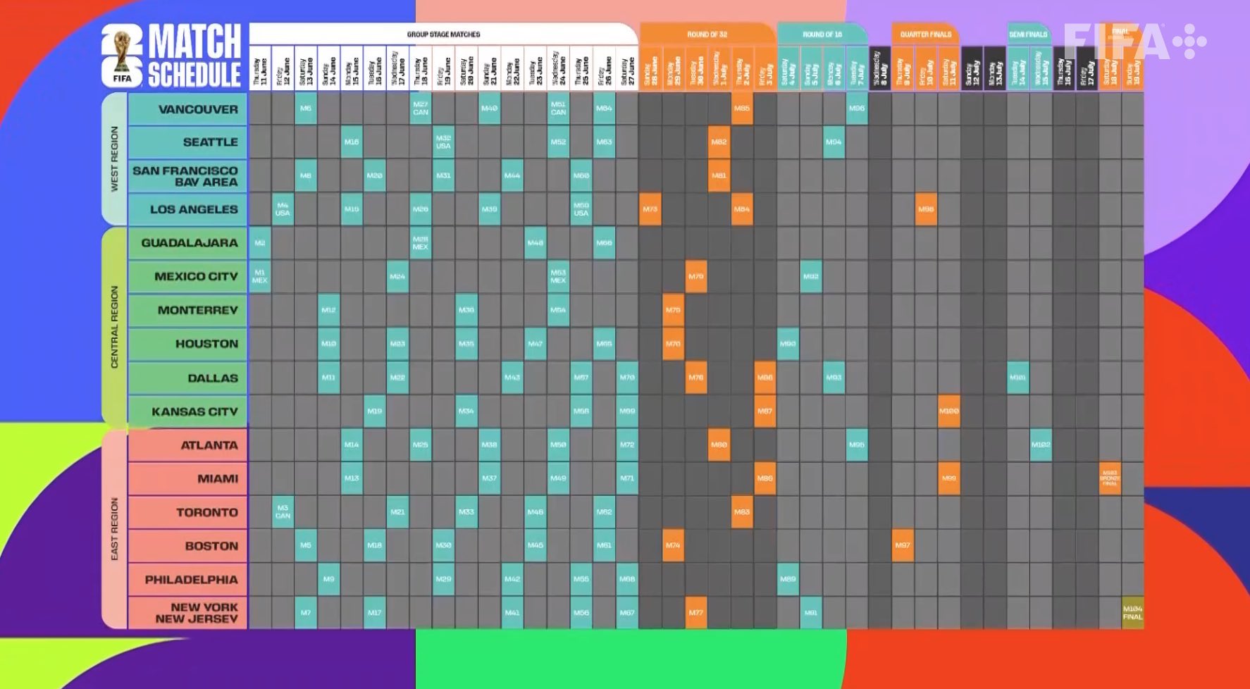 En total, el torneo contará con una suma récord de ¡104 partidos! dado que la cantidad de participantes escaló de 32 a 48 selecciones, por lo que la fase de grupos pasará a contar con doce zonas con cuatro equipos cada una en un total de 72 partidos en esa instancia. El recinto que contará con la mayor cantidad de juegos será el ya mencionado AT&T Stadium, con nueve juegos por disputarse en esa sede.