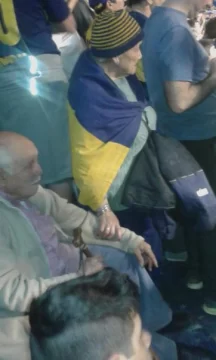 Ella, con una bandera en los hombros y un gorrito xeneize, lo toma de la mano izquierda a él, que observa el partido sentado, con un bastón con su mano derecha.