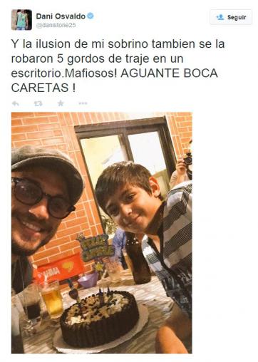 "Y la ilusión de mi sobrino también se la robaron 5 gordos de traje en un escritorio. Mafiosos! AGUANTE BOCA CARETAS!", escribió en su cuenta el delantero.