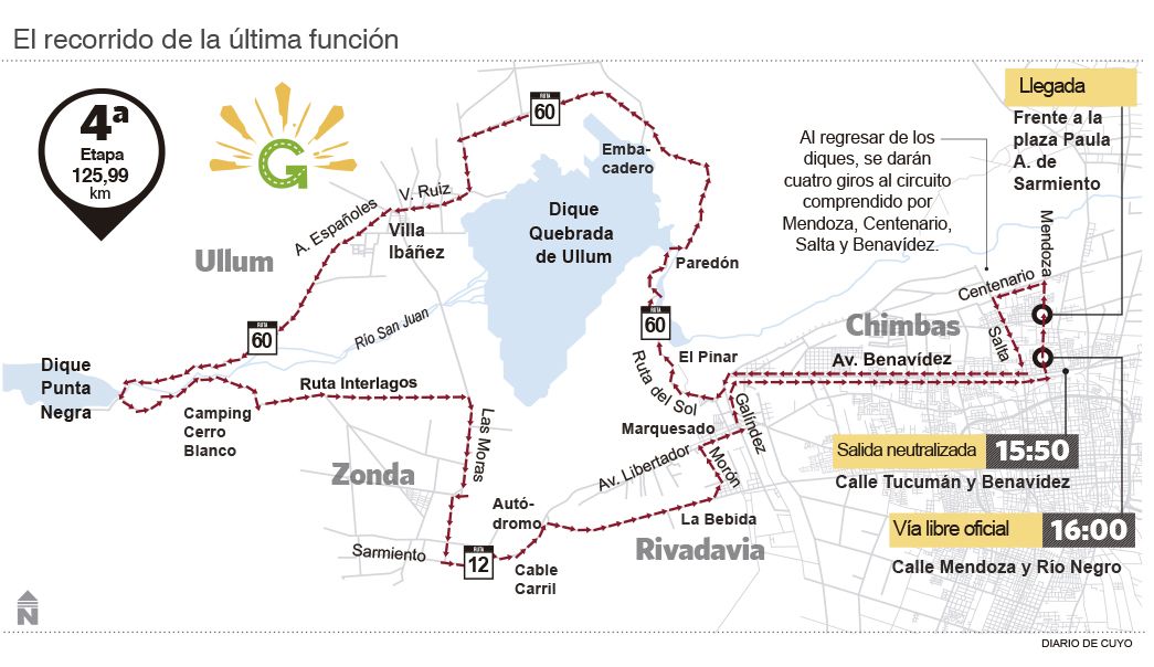 En la última etapa, aparte de la bonificación doble, se realizará tres metas volantes una será en la puerta del complejo Palmar del Lago, otra en el Cablecarril y la última en el primer paso por la línea de meta del circuito.