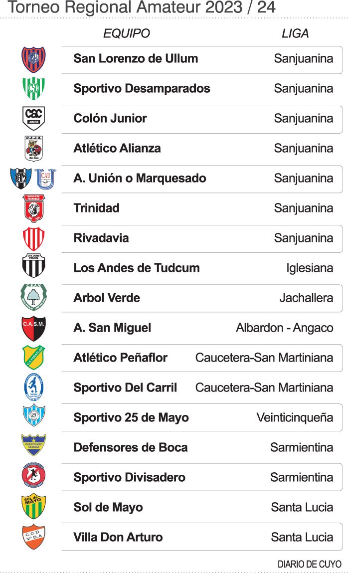 La Liga Sarmientina tendrá doble representación en esta nueva edición, al igual que la Liga Caucetera-Sanmartiniana y la Liga de Santa Lucía. Defensores de Boca, subcampeón de la Copa de Clubes Campeones, se quedó con una de las plazas que estaban en juego desde la Federación, por lo que el reciente campeón Sportivo Divisadero se metió en el Regional Amateur, tras esa histórica conquista en el Sur sanjuanino. Desde el Este, los representantes serán provenientes del departamento San Martín ya que el legendario y multicampeón, Atlético Peñaflor estará en competencia junto a Sportivo Del Carril, que se decidió por la plaza que dejó vacante Villa Etelvina. En Santa Lucía, tienen todo listo para que Villa Don Arturo y Sol de Mayo sean sus representantes en el Regional.