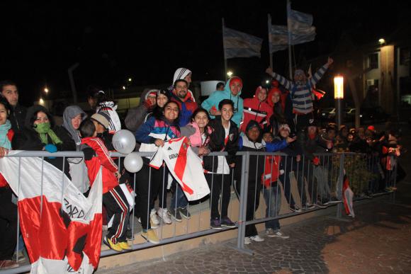 A pesar del frío y la larga espera, hubo un buen número de fanáticos riverplatenses en el hotel, que alentaron al equipo y lograron ver a sus ídolos desde cerca.
