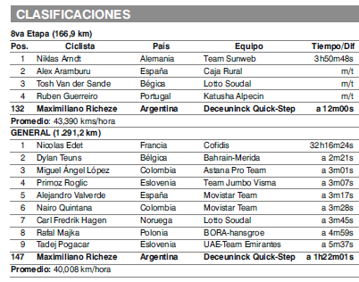 El francés encabeza ahora la general con 2 minutos 21 segundos de renta sobre el belga Dylan Teuns (Bahrain Merida) y con 3m01s sobre el propio "Superman" López, que pese a todo no se mostró excesivamente preocupado delante de los periodistas en la zona mixta. Sabe que la malla roja está cambiando con facilidad en esta edición y espera que Edet afloje en los próximos días.