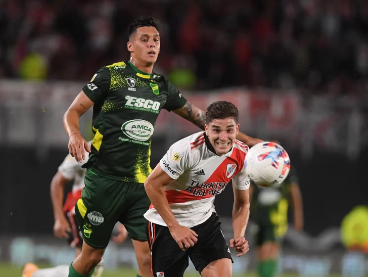 El "millonario" ejecutó un primer tiempo brillante ante otro de los equipos que mejor juega en la Liga. Con pases precisos, verticales y rápidos, River monopolizó la pelota, se adueñó del mediocampo y encontró el gol antes de los diez minutos con el cabezazo cruzado y perfecto de Enzo Fernández, luego del centro de Milton Casco. River, fiel a su estilo, continuó con la presión ante un Defensa desbordado. Gabriel Hachen no encontró espacios y Walter Bou se perdió entre las marcas ajustadas de Paulo Díaz y David Martínez.