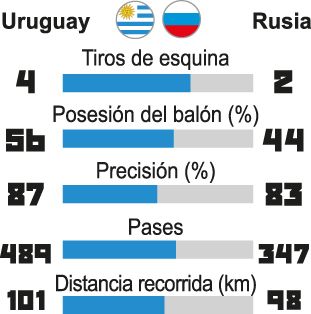 Ayer, con la presión de enfrentarse al local la Celeste quería mejorar algunos aspectos futbolísticos que restaban pulir para lo que viene, incluso mejorar en eficacia sabiendo que los triunfos anteriores los había conseguido por la mínima diferencia. Por eso fue importante la goleada, porque Uruguay hizo una exhibición de jerarquía, dominó todas las facetas del juego y sentenció la victoria en la primera parte, ante un rival que acude a los octavos preocupado por su escasa solvencia. Otra buena noticia para los de Tabárez, fue que los que entraron desde el banco -introdujo cuatro cambios- todos respondieron a la perfección.