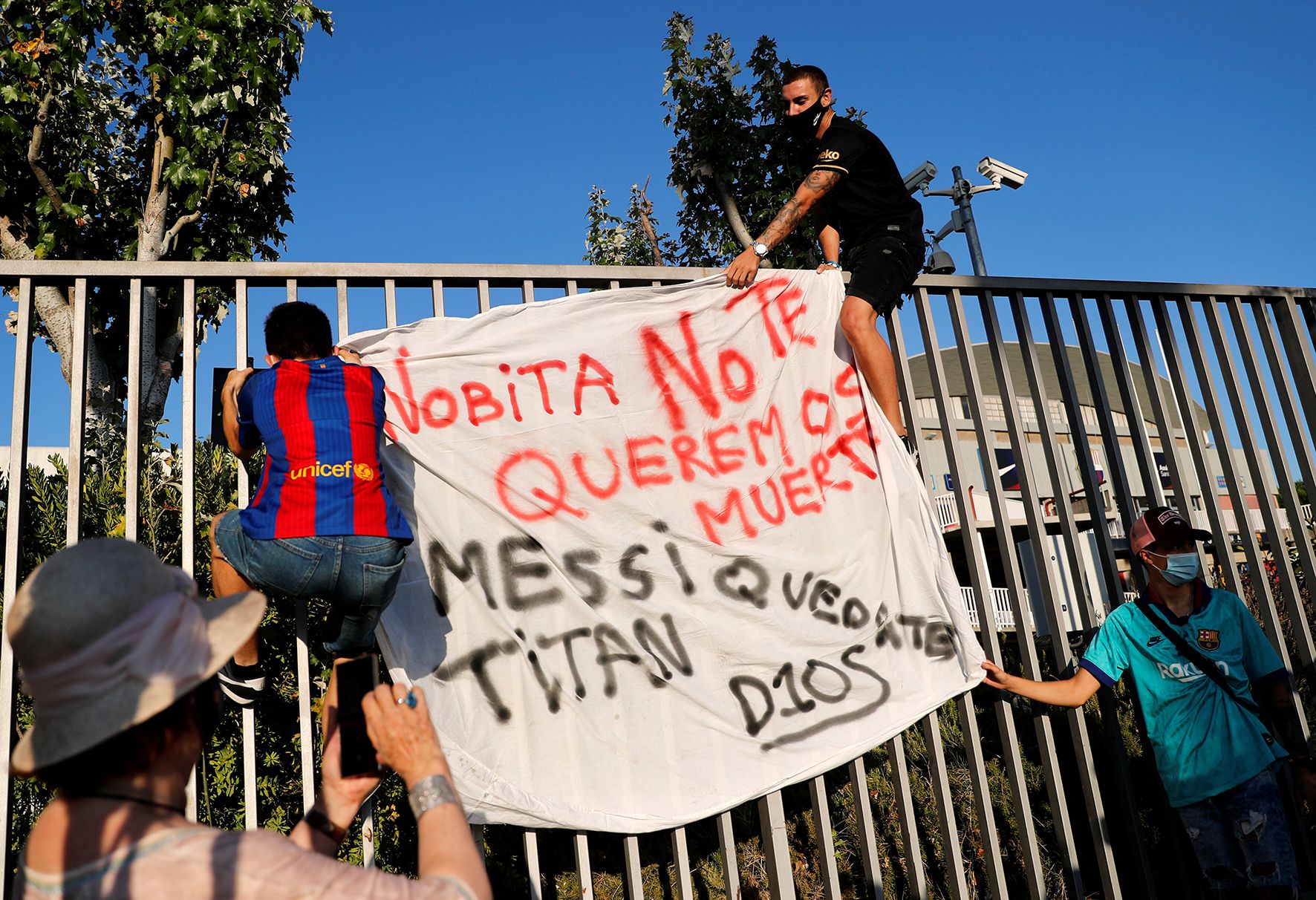 La decisión de Messi de irse de Barcelona generó ayer las protestas de los fanáticos que piden por la renuncia del presidente del club, Josep Maria Bartomeu. De hecho, se colgaron banderas en tal sentido (foto) e incluso un portón abierto del club casi deriva en que los presentes se metan en el estadio por la fuerza.