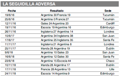 Los Pumas buscarán el triunfo y a su vez cortar una sequía más que alarmante de victorias contra las cinco potencias europeas de este deporte como son Inglaterra, Irlanda, Gales, Escocia y los propios galos. La última alegría contra uno de ellos fue justamente ante los "blues" apenas terminó el Mundial pasado donde la Argentina fue cuarta: en junio del 2016, en Tucumán, la victoria albiceleste fue de 30-19 para el equipo de Daniel Hourcade. Luego vinieron nada menos que 14 reveces en fila ante estas potencias, con la salvedad que en el medio se le pudo ganar a Italia, que juega el Seis Naciones (torneo de selecciones del Continente europeo), pero que está claramente más de un escalón por debajo de los otros "colosos".