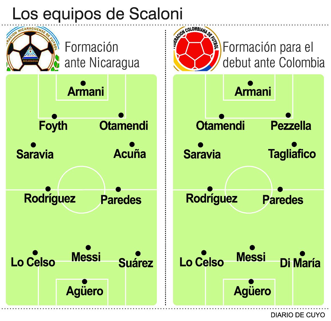 Entrarían Pezzella, Tagliafico y Di María, por Foyth, Acuña y Suárez, respectivamente.