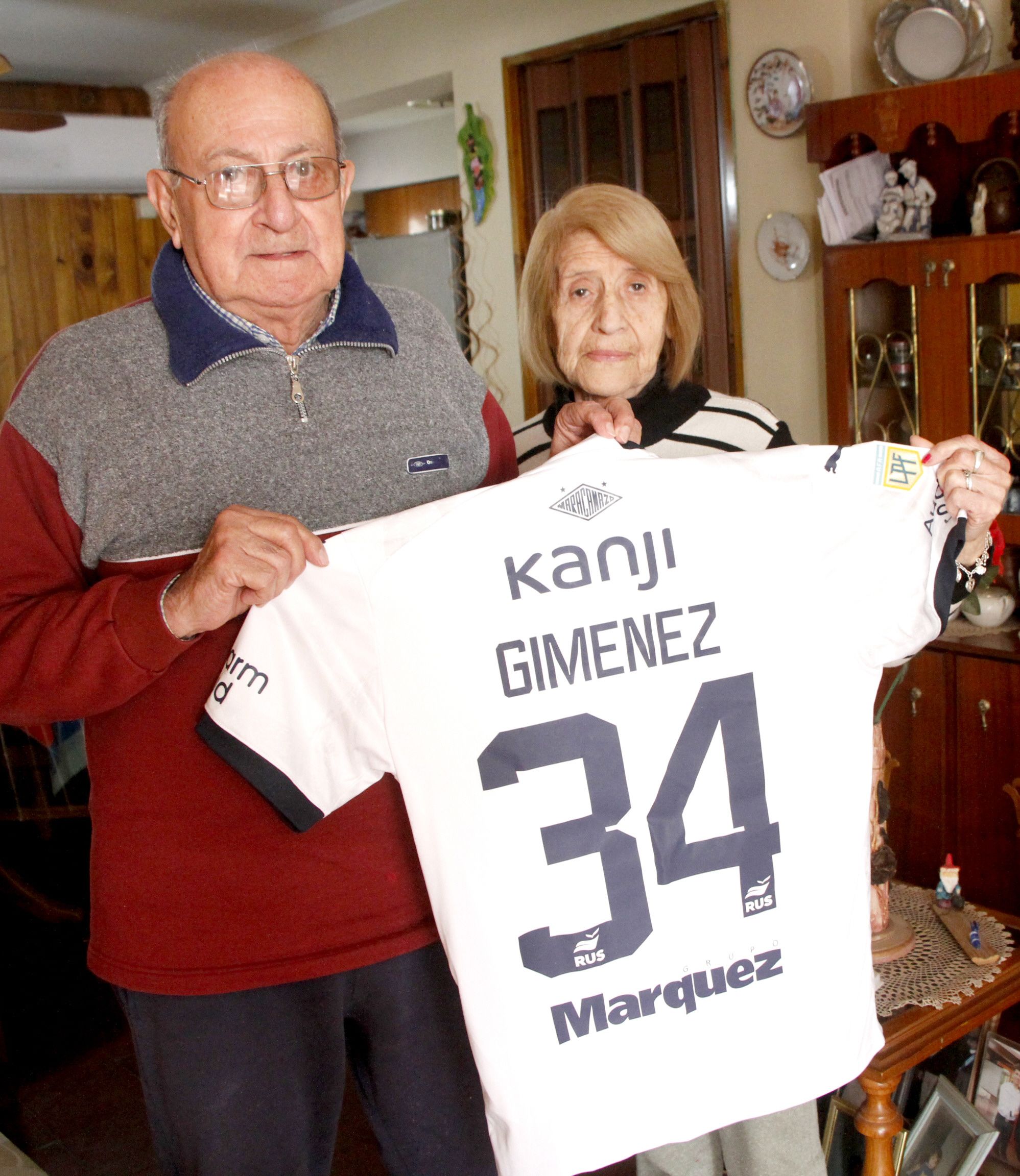 Recuerdo. La camiseta del partido contra Godoy Cruz quedó en manos de sus abuelos Héctor y María del Rosario.