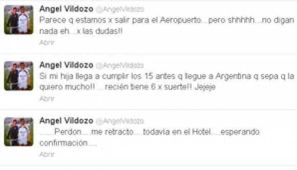 Al respecto, Vildozo fue contando a través de su cuenta de Twitter los hechos relacionados con el retraso en los vuelos y la consecuentemente demora a Buenos Aires. “En Venezuela todavía, esperando la confirmación del vuelo para volver!!!”, fue el primer tweet del delantero, que continuó expresando: “Ahora parece que nos vamos mañana, el tema es el rumor de que nos quedamos sin hotel esta tarde!“.