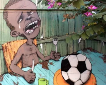 Buenos Aires, 24 de mayo.- Parte del pueblo brasileño mostró su enojo por la realización en su casa del Mundial. Hubo manifestaciones y violentos enfrentamientos. Ahora, un artista urbano pintó un mural que refleja el sentimiento de muchos compatriotas.