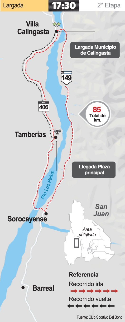 Con dos esfuerzos comenzará a disputarse hoy la "Vuelta a Calingasta", carrera que el Club Juan B. Del Bono montará íntegramente en el departamento cordillerano; una prueba que emulará a la clásica rutera, la que por motivos de las obras viales no puede realizarse como fue habitual, viajando desde San Juan, y regresando, hacia y desde Calingasta.