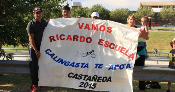 Es común en cada etapa de esta Vuelta a San Juan observar banderas en apoyo a los equipos, a los ciclistas o incluso expresando la pasión que genera esta competencia que cada enero revoluciona a los sanjuaninos. Demostrar el apoyo plasmado en una bandera, ya sea con mucho o poco ingenio, es digno de valorar. Como también resulta válido destacar lo realizo por Sebastián Carbajal, Fernanda Salinas, Enzo Luna, Jorge Castañeda y los pequeños Joaquín y Delfina, quienes viajaron ayer desde Calingasta exclusivamente para darle su voz de aliento a Ricardo Escuela.