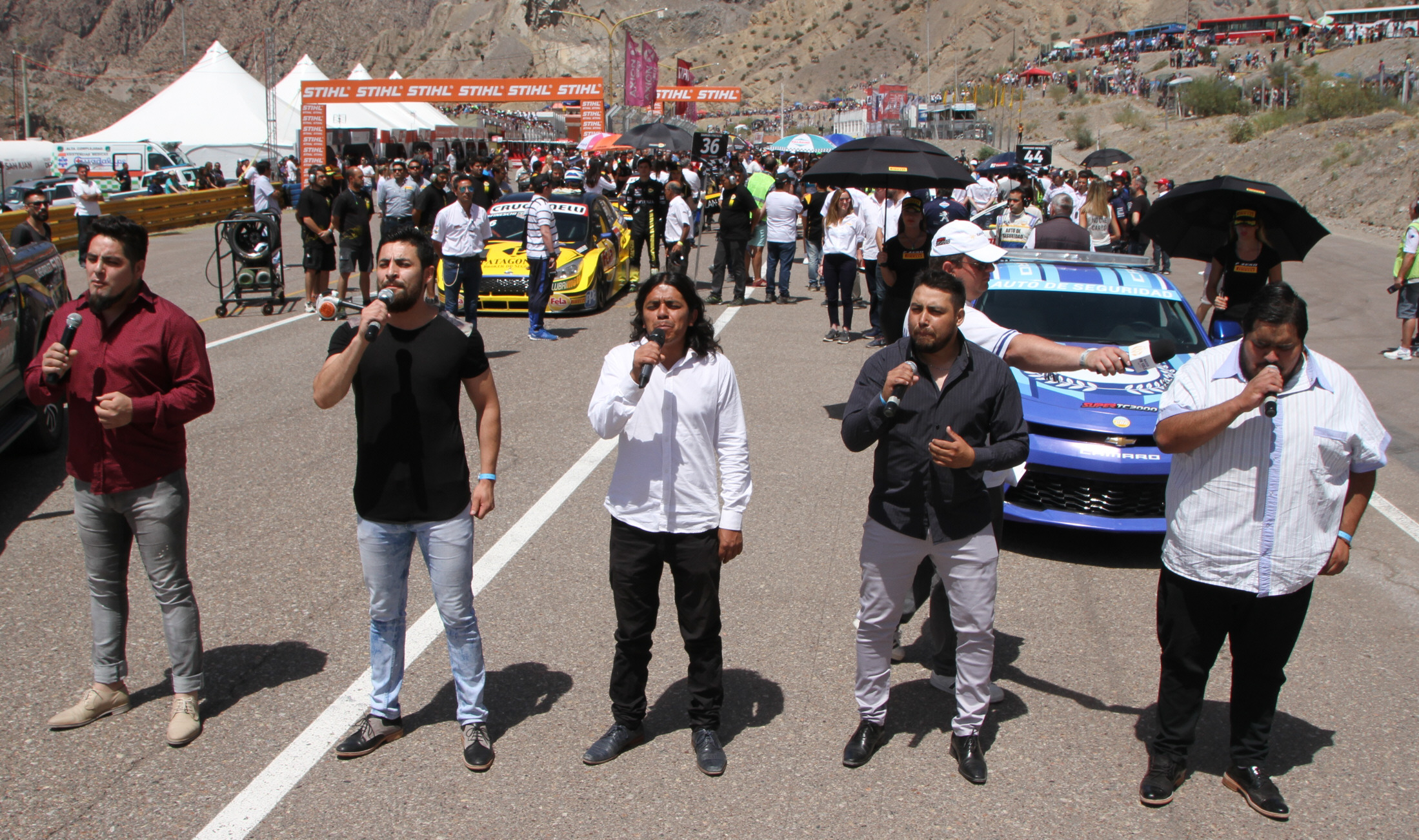Desde que el quinteto entonó el Himno Nacional Argentino en la última defensa de Leonela Yúdica, su versión ya es un clásico en los grandes eventos. Ayer, Adolfo Vidable, Claudio, David y Ricardo Martínez, junto a Juan Cruz Rufino y el "Grillo" Malbrant volvieron a emocionar a todo el mundo en el Autódromo "El Zonda".