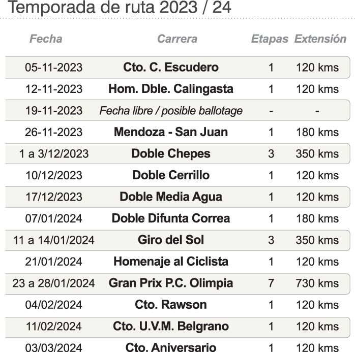 En la última reunión de consejo directivo de la FCS (Federación Ciclista Sanjuanina) se aprobó el calendario de la temporada de ciclismo en ruta 2023-2024. El programa de competencias se iniciará el domingo 5 de noviembre, con la vigésima edición del Circuito Carlos Escudero; y culminará el 3 de marzo con el característico Circuito Aniversario de La Bebida, también conocido como "Clausura".