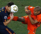 La “víctima” fue el español Xavi Alonso a los 23 minutos del primer tiempo en Johannesburgo, en una jugada intrascendente en la mitad de la cancha.