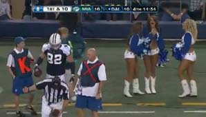El jugador de football americano Jason Witten no midió bien los espacios al atajar una pelota en un partido de los Cowboys de Dallas vs. Miami Dolphins. Su error lo pagó la bellísima porrista Melissa Kellerman, que cayó de cara al piso.